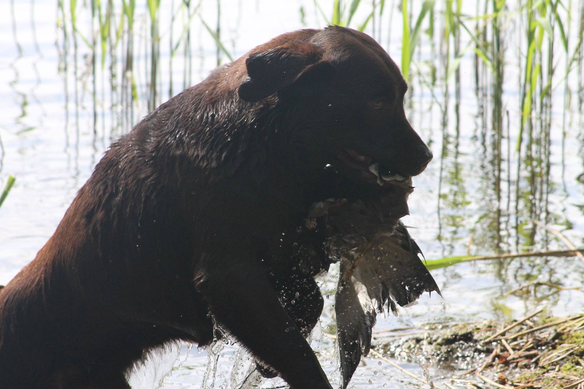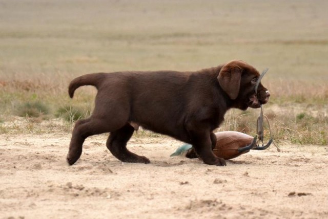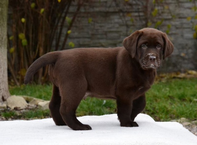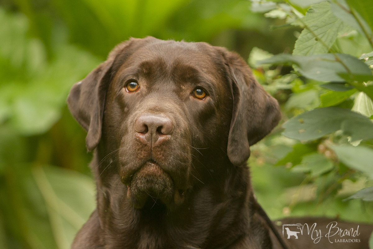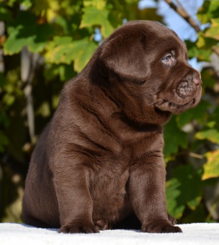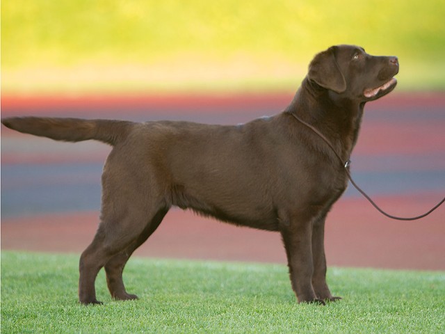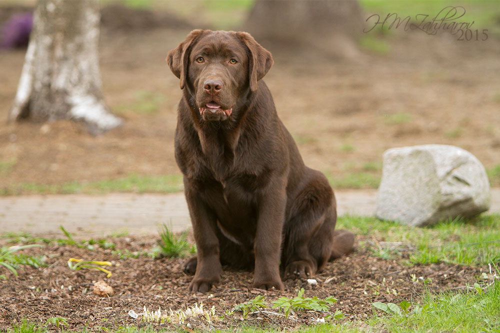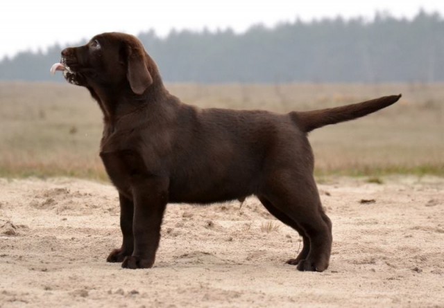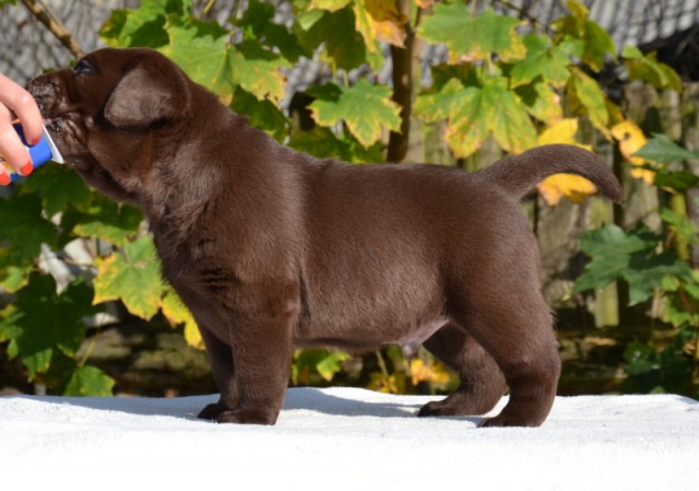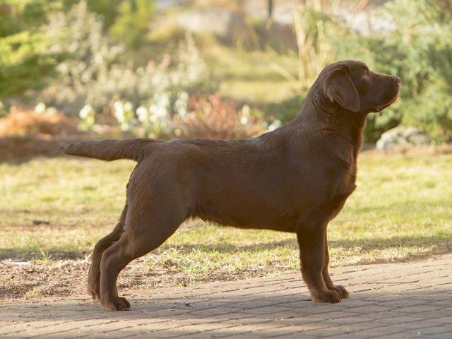 “Very attractive well built chocolate dog, little light in eye color, good clean neck, excellent shoulders, good depth of chest, well boned legs, nice stiffle, overall very attractive, very matured for his age.”