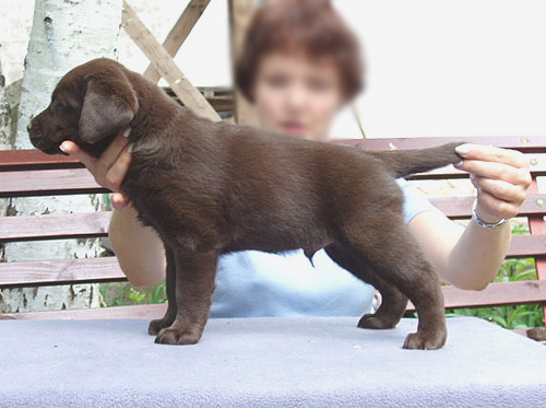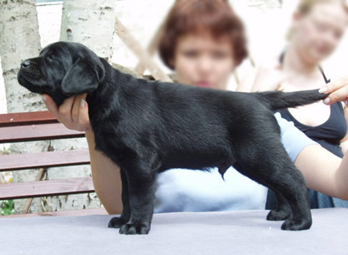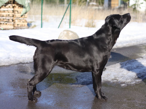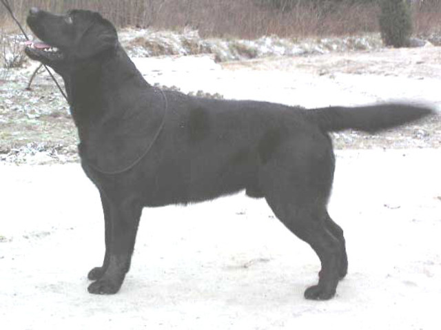 Barbara Müller (Svitzerland) 3.08.2002 Retriiverite erinäitus Leedus – “5,5 months old black dog, strong bones, masculin head, nice stop, excellent neck, strict topline, well arched feet, nicely angulated, moves nicely, excellently presented. “