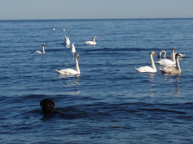 HAA! I found the promised picture of Nimbus (Mallorn’s Chocomania) swimming with 30 swans. Actually, there were several of them.