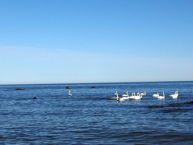 In the spring, birds gather in our bay, and there are many of them, from seagulls to swans. The swans are simply beautiful!