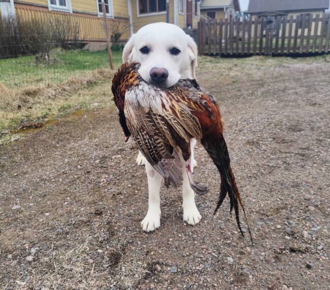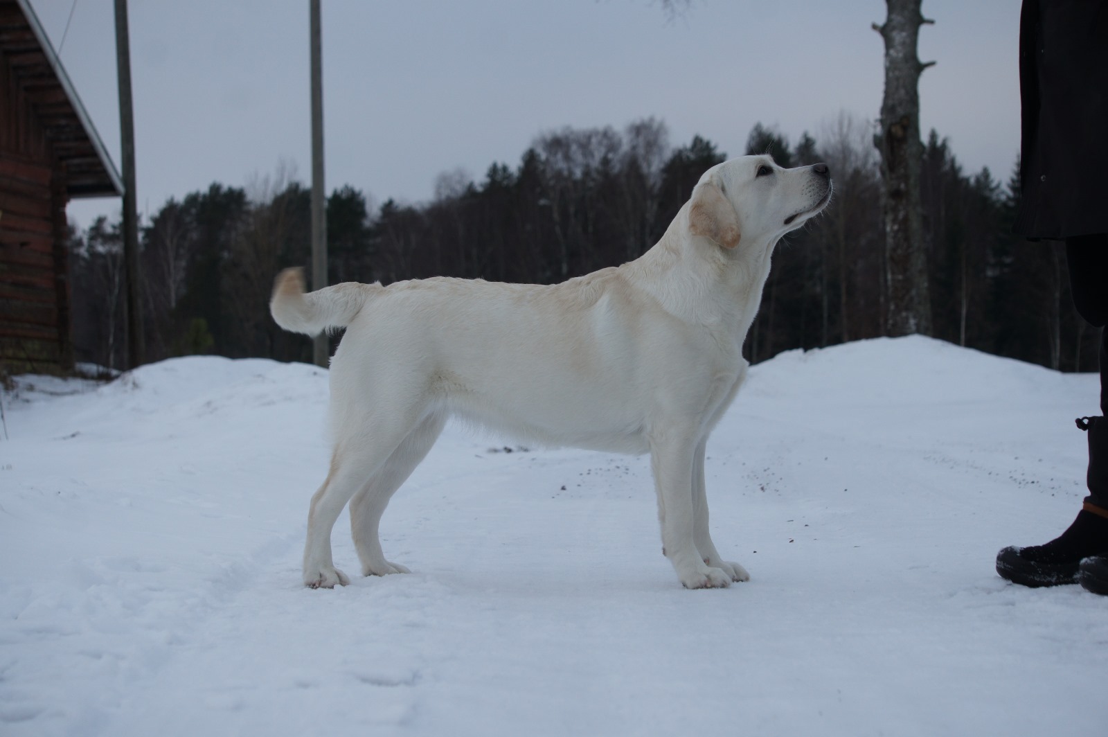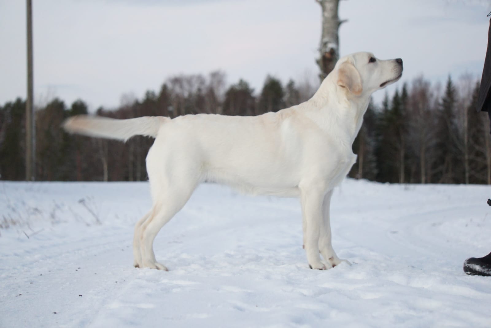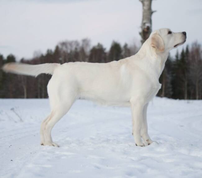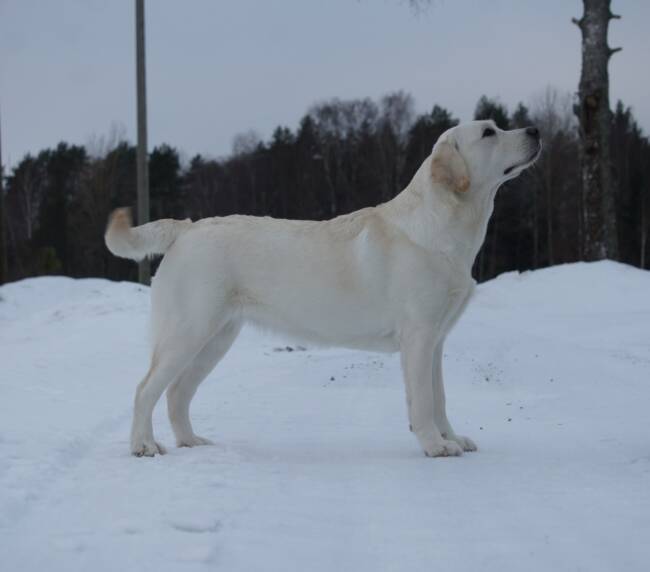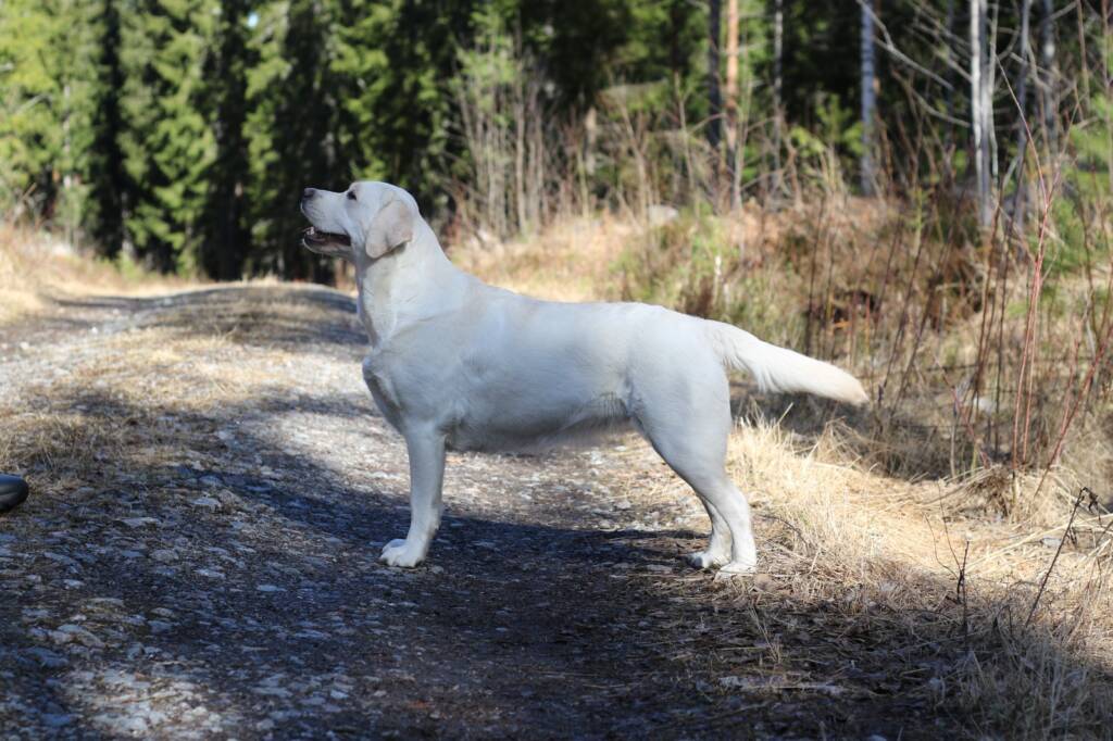 “Erinomainen tyyppi. Pehmeäilmeinen pää. Erinomainen pigmentti. Kokoon sopiva raajaluusto. Hyvät suorat eturaajat. Kaunis kaula. Lupaava eturinta. Hieman niukka pohjavilla tänään. Hyvät takakulmaukset. Lupaava rintakehän muoto. Käyttää häntäänsä niin voimakkaasti, että koko kroppa liikkuu. Esiintyy edukseen.”